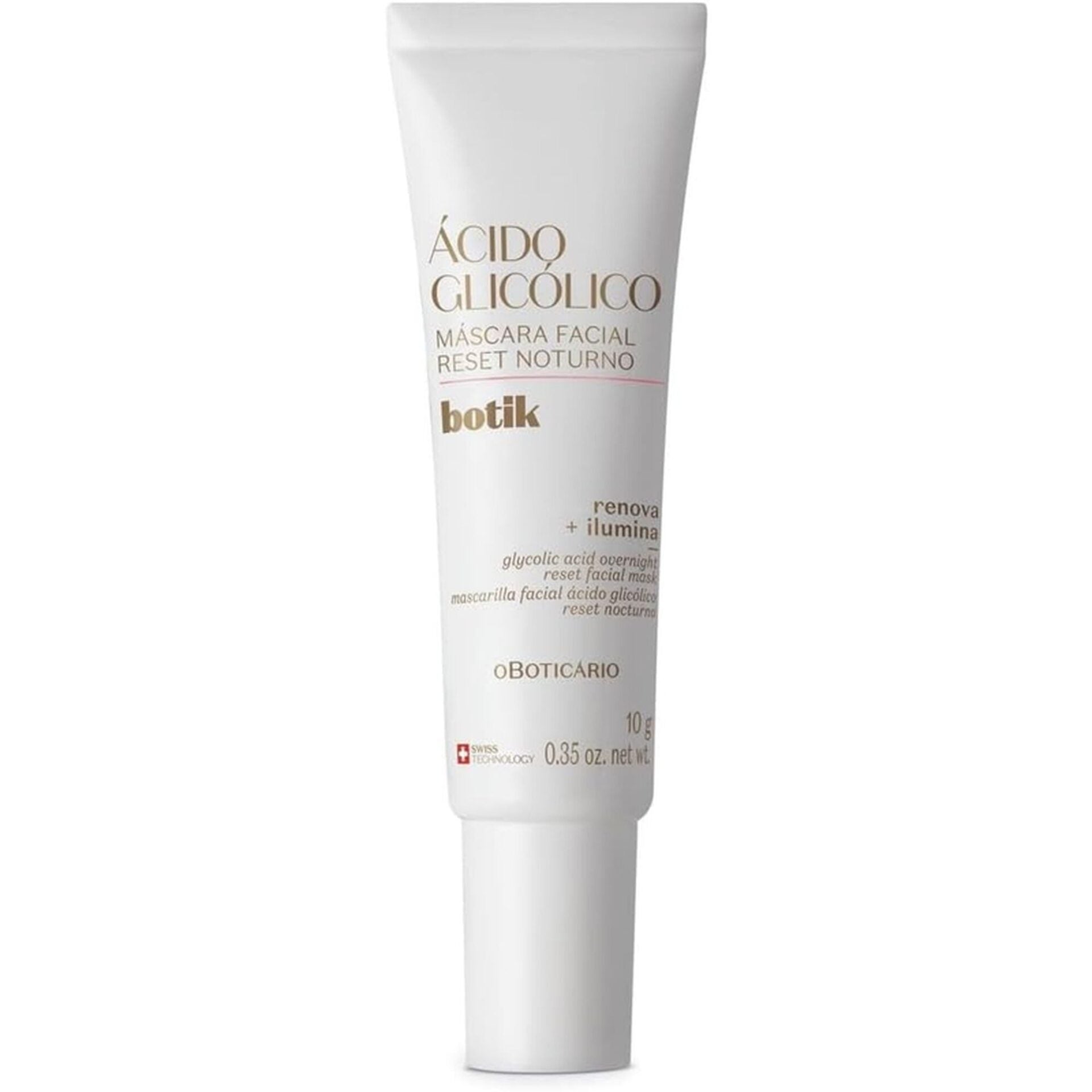 A Máscara Facial Reset Noturno com Ácido Glicólico (10g) atua durante a noite, promovendo a renovação celular e deixando a pele mais macia e radiante ao acordar.